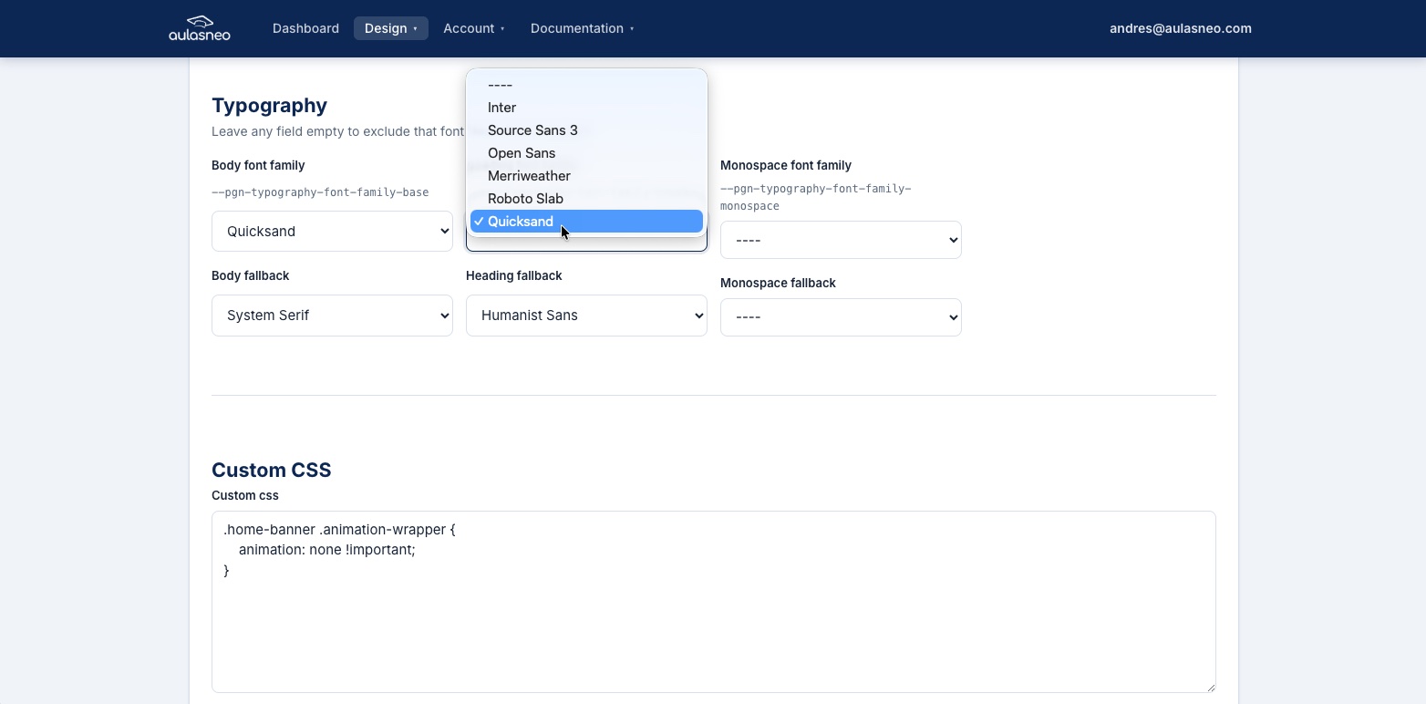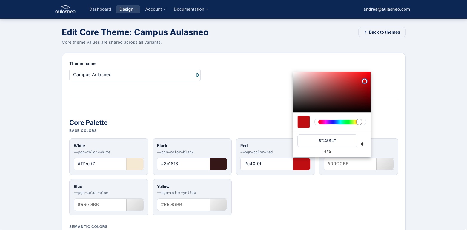 A CSS theme is the foundation of your visual identity in Branding by Aulasneo. It defines the colors, typography, spacing, and any global CSS overrides that will be applied across your Open edX site. Themes are compiled into CSS files and served to the Open edX Micro-Frontend (MFE) layer at runtime.