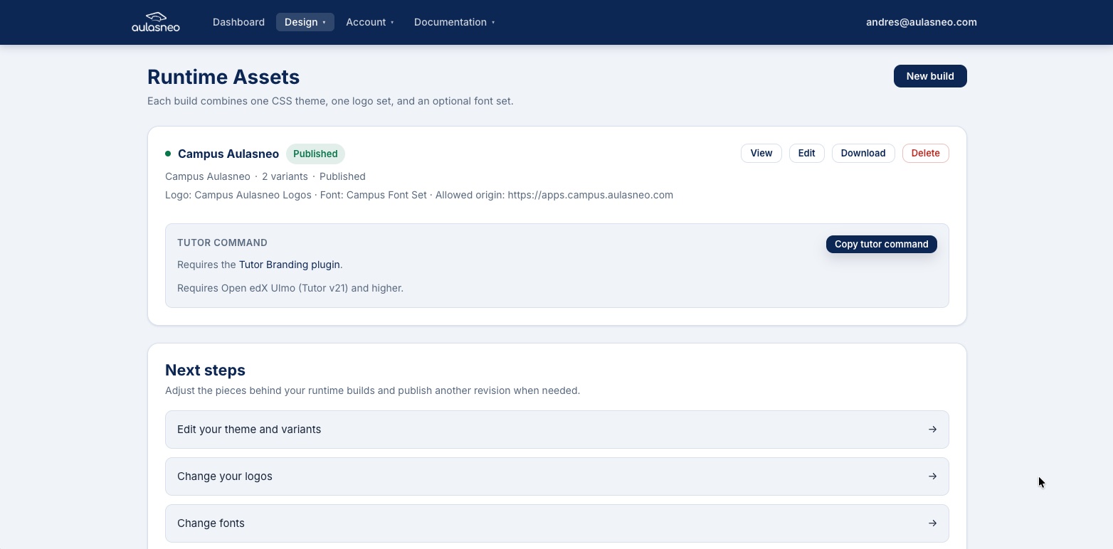 There is no need to rebuild Docker images, restart services, or re-run the Tutor command for color, typography, or CSS override changes. See Installation for a full list of cases that do and do not require re-running the Tutor command.