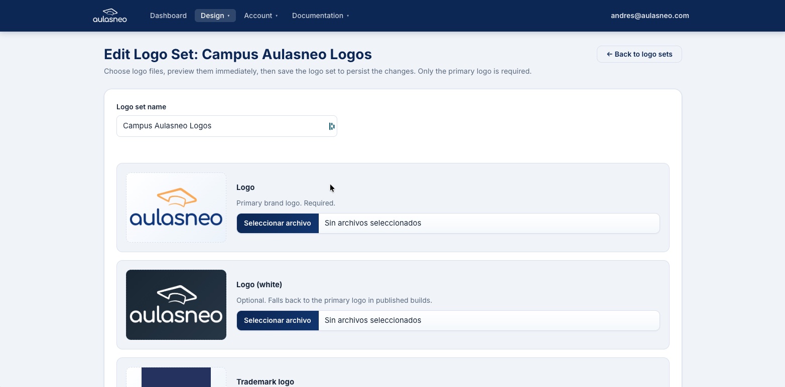 The logo set editor allows you to upload multiple logo variants and a favicon in a single form.