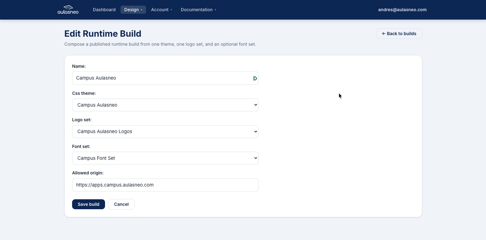 The build editor combines a theme, logo set, and font set into a deployable package.